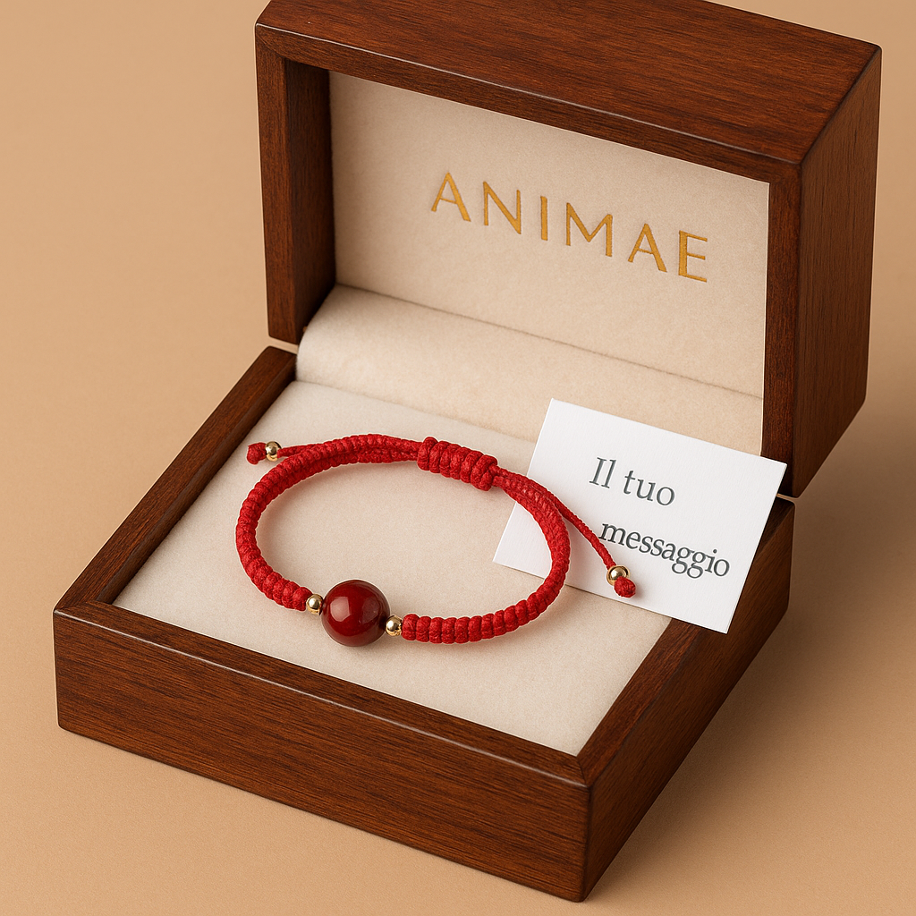 Il bracciale rosso con la pietra di corallo simboleggia il “filo rosso del destino”, una leggenda giapponese che collega le persone destinate a incontrarsi. Indossarlo è un gesto di protezione e connessione.